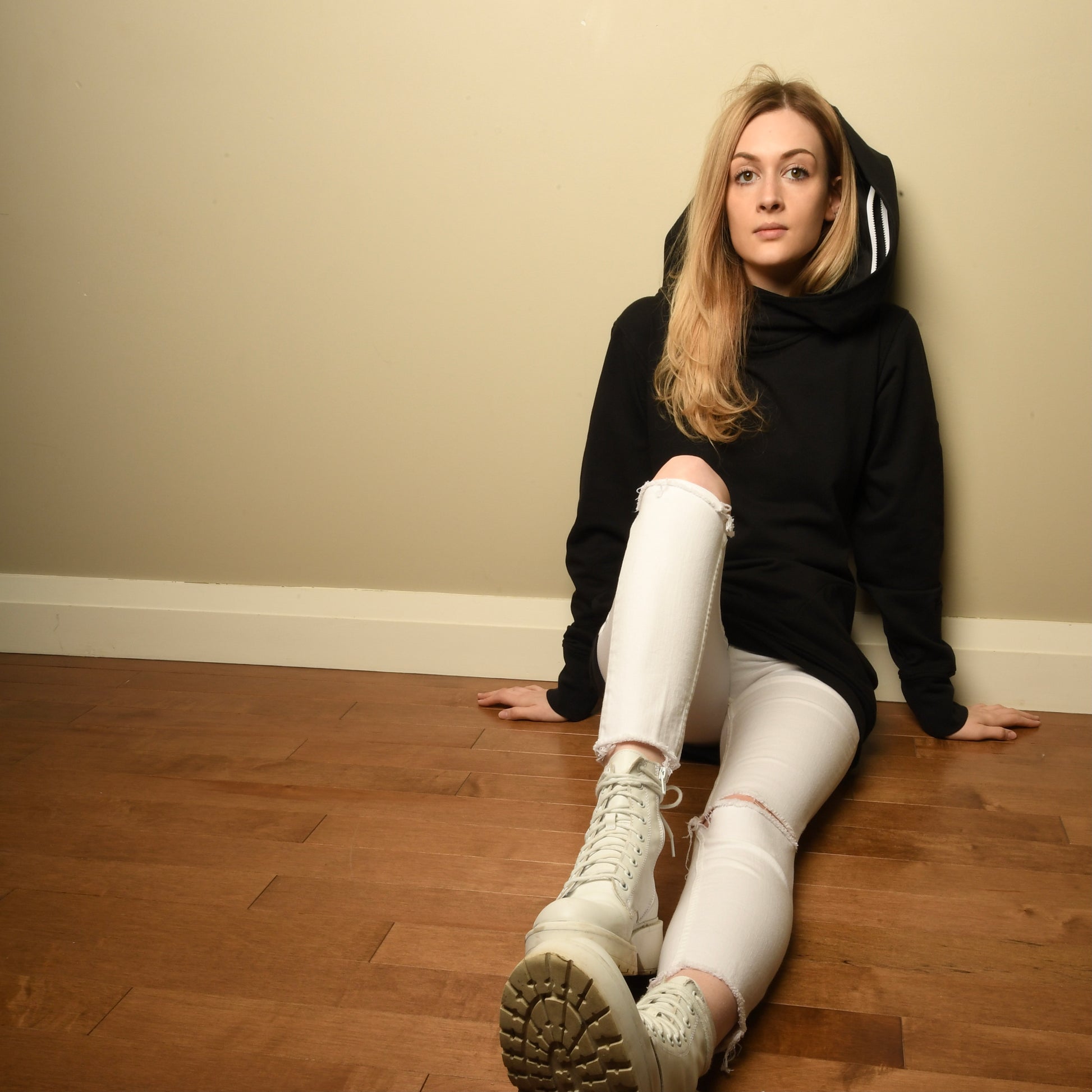Enhance you figure with our ladies fitted hoodie. Perfect length for leggings and skinny jeans. A crossover neckline and a large black satin lined hood including our signature zippered storage pocket highlighted with a white zipper. A zippered pocket on left sleeve ideal for debit/credit card, cash, keys, earbuds etc. And slit pockets for everything else. Layer it under your jacket or wear it on its own, either way you'll look fabulous!